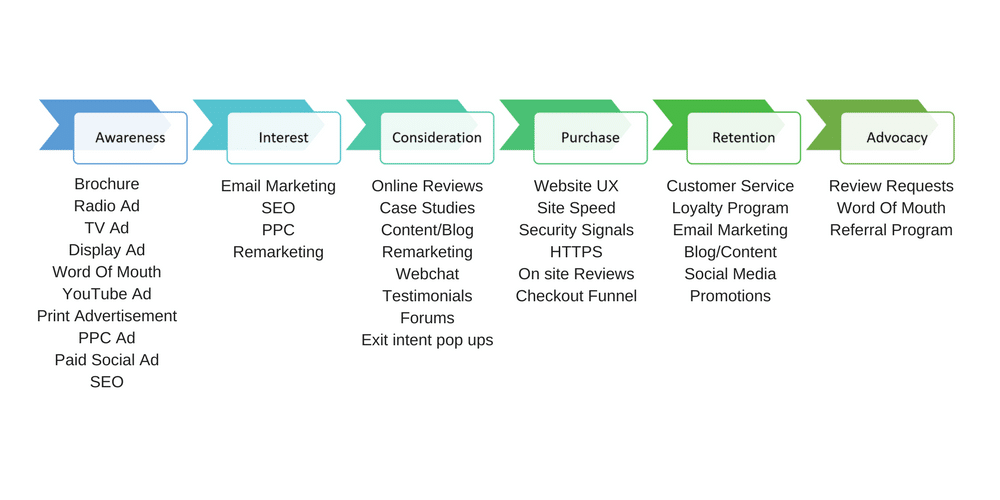 The chart below details the customer journey and how digital channels can ensure that you stay in front of mind and in a positive way.